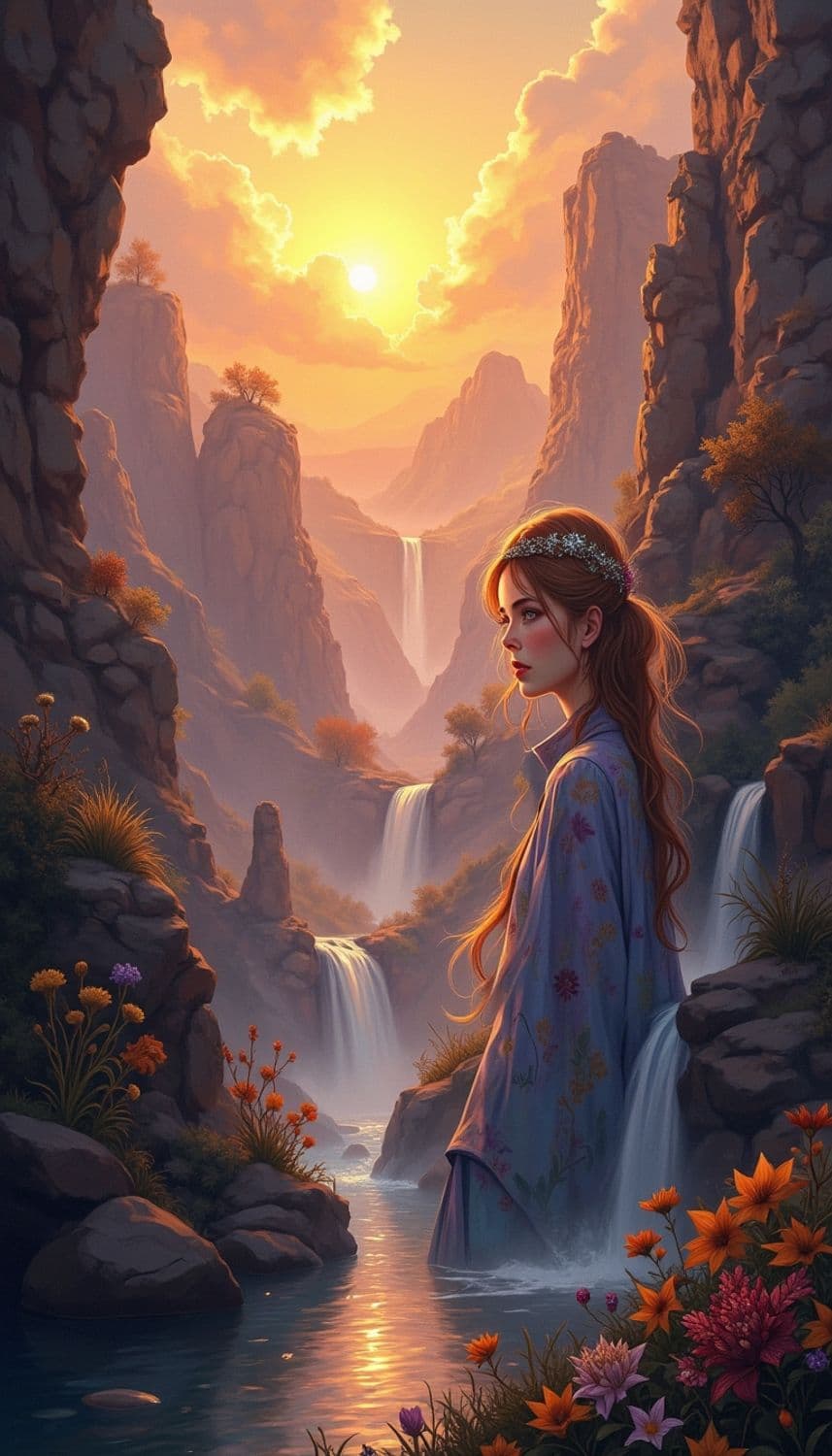 In a mystical, enchanted canyon bathed in the warm hues of a setting sun, a captivating female figure stands amidst towering rock formations and cascading waterfalls. Her attire is a flowing, ethereal gown crafted from a shimmering, translucent fabric that captures the colors of a desert sunset, blending shades of deep amber and soft rose. Her hair, a striking shade of sunlit copper, cascades down her back in intricate waves, framing a face with delicate, serene features. Her eyes, a captivating shade of desert gold, seem to reflect the vibrant energy of the canyon. She wears a delicate circlet made of entwined desert vines and tiny, twinkling gemstones, enhancing her ethereal and otherworldly presence. The background is a breathtaking scene of rugged cliffs and gentle, glowing pools that catch the last light of the day, creating a serene and enchanting atmosphere. The style is a blend of fantasy and natural elegance, with a focus on warm color tones and intricate detailing, creating a mesmerizing and otherworldly atmosphere.