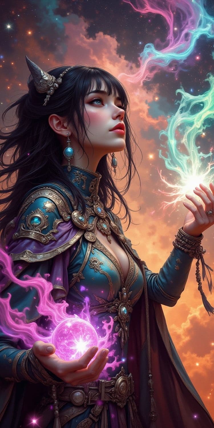 The image portrays a mystical female enchantress adorned in ornate, jeweled armor with intricate patterns. She stands against a vivid cosmic backdrop of swirling clouds and starry skies, holding glowing orbs of magical energy in varying colors, emanating ethereal wisps. Her hair is dark and adorned with elaborate silver jewelry, including a horn-like accessory. The expression on her face is serene and focused, suggesting mastery of magical arts.