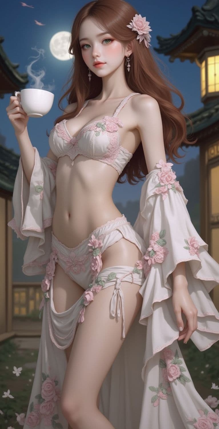 An ethereal figure stands gracefully under the moonlight, holding a steaming cup. She is adorned in intricately embroidered attire featuring floral patterns in soft pink hues. Her long, flowing brown hair is embellished with a matching flower, and she gazes calmly with a serene expression. The background reveals a traditional architectural setting under a night sky, illuminated by glowing lanterns.