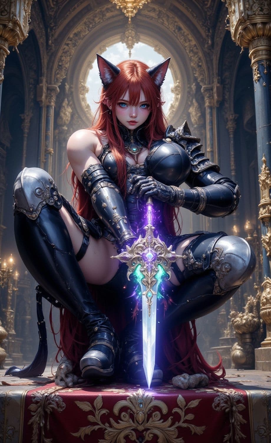 A fierce warrior with fox-like ears and long red hair kneels in a grand ornate palace. She wears a suit of dark and intricate armored plating, with a glowing magical sword held upright. Her piercing blue eyes are focused intensely. The background consists of grand columns and luxurious decor, adding to the majestic ambiance.