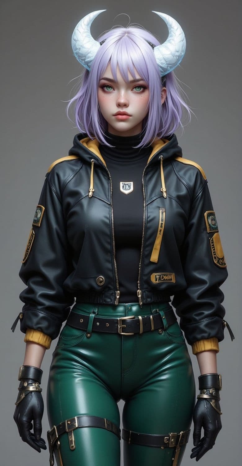 A young, striking character with vivid lavender hair and pale blue, textured horns extending from her head. She wears a black and yellow leather jacket with intricate patches and zippers, and form-fitting, glossy green pants accented with belts and straps. Her black gloves and confident stance give her an air of authority and style.