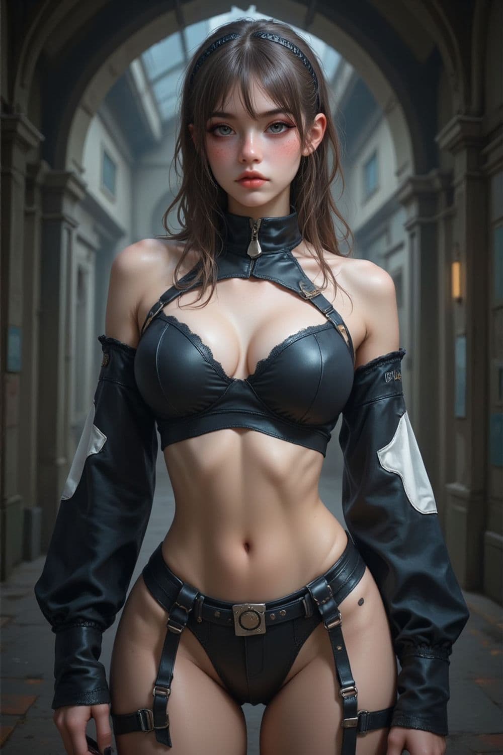 A striking character stands in a grand hallway, wearing a futuristic black leather outfit featuring a bralette and high-waisted bottoms with harness details. Her long brown hair is adorned with a headband, and she gazes forward with an intense expression. The setting contains arched ceilings, adding a sense of grandeur and mystery.