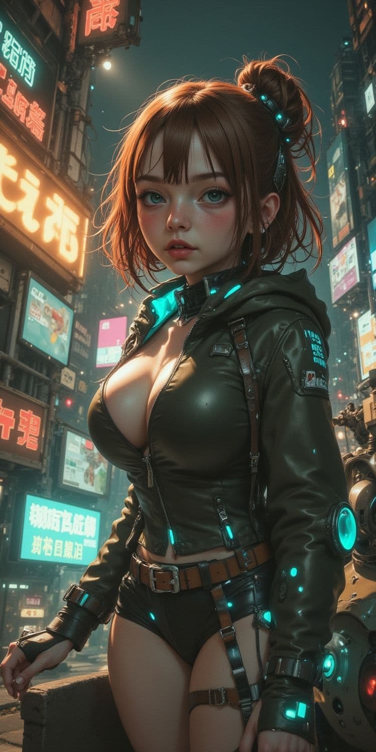 The image showcases a stylized, futuristic scene featuring a young woman with short, light brown hair styled into a messy bun. She wears a sleek, high-tech outfit with glowing teal accents on her jacket, belt, and wrist. The background is an urban environment filled with illuminated neon signs and advertisements in various languages, creating a cyberpunk atmosphere.