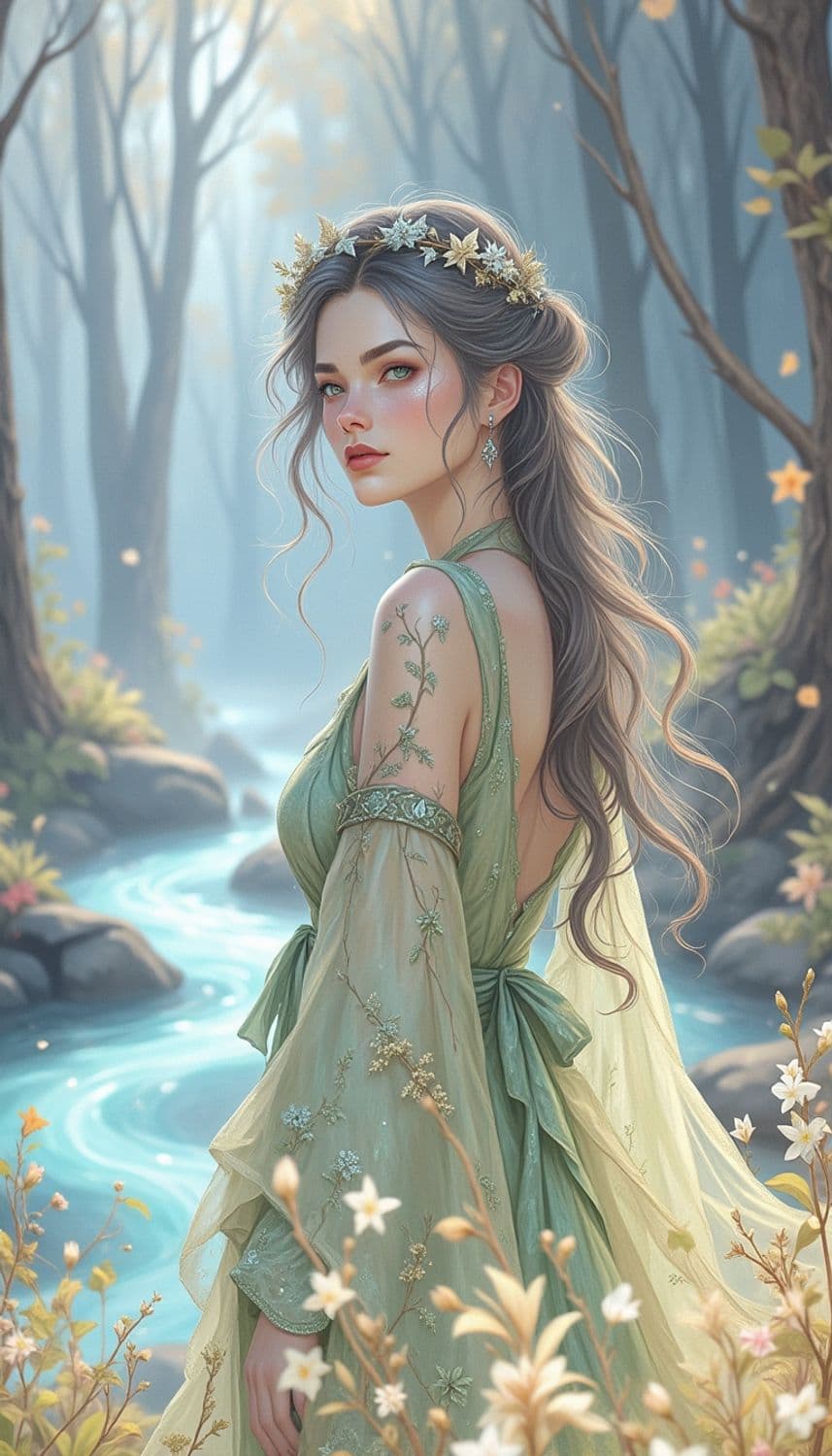 In a mystical, ethereal realm of floating, luminescent misty forests under a sky painted with the colors of a serene dawn, a captivating female figure stands poised on a shimmering, translucent mist platform. Her attire is a flowing, elegant gown crafted from a fabric that seems to capture the essence of morning dew, blending shades of soft emerald and shimmering pearl. Her hair, a striking shade of dawn lavender, cascades down her back in intricate, flowing tendrils, framing a face with delicate, serene features and a gentle, contemplative smile. Her eyes, a mesmerizing shade of forest jade, seem to reflect the mysteries of the woodland world. She wears a delicate crown adorned with tiny, luminescent dew drops and silver vines, enhancing her celestial and otherworldly presence. The background is a breathtaking scene of luminescent misty forests and gentle, glowing streams that weave through the realm, creating a serene and enchanting atmosphere. The style is a blend of fantasy and forest elegance, with a focus on cool color tones and intricate detailing, creating a mesmerizing and otherworldly atmosphere.