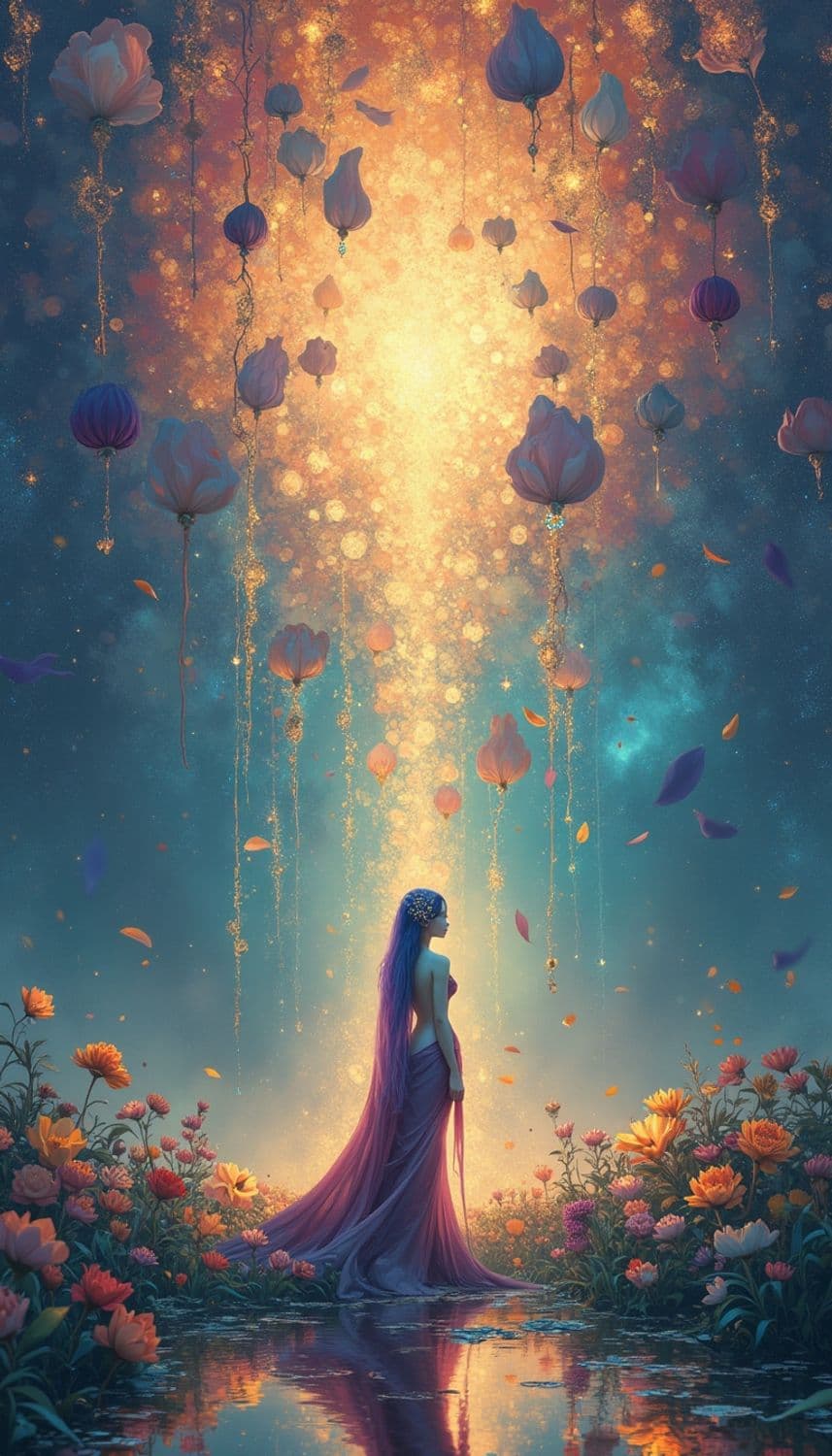 In a mystical, ethereal realm of floating gardens suspended in a sky painted with twilight hues, a captivating female figure stands amidst a cascade of glowing petals. Her attire is a flowing gown crafted from a fabric that seems to capture the essence of twilight, blending shades of deep plum and shimmering gold. Her hair, a striking shade of twilight violet, cascades down her back in intricate, flowing waves, framing a face with delicate, serene features. Her eyes, a mesmerizing shade of twilight teal, seem to reflect the mysteries of the evening sky. She wears a delicate headpiece made of intertwining vines and tiny, luminescent jewels, enhancing her mystical and otherworldly presence. The background is a breathtaking scene of luminescent gardens and gentle, glowing streams that weave through the realm, creating a serene and enchanting atmosphere. The style is a blend of fantasy and celestial elegance, with a focus on vibrant color tones and intricate detailing, creating a mesmerizing and otherworldly atmosphere.