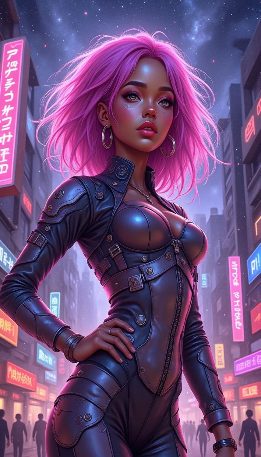 A striking female figure stands confidently in a futuristic urban setting. She has vibrant pink hair and wears a form-fitting black leather outfit adorned with metal buttons and straps. The background is a neon-lit cityscape with various signs and silhouettes of people. Her intense gaze and bold stance exude strength and mystery.