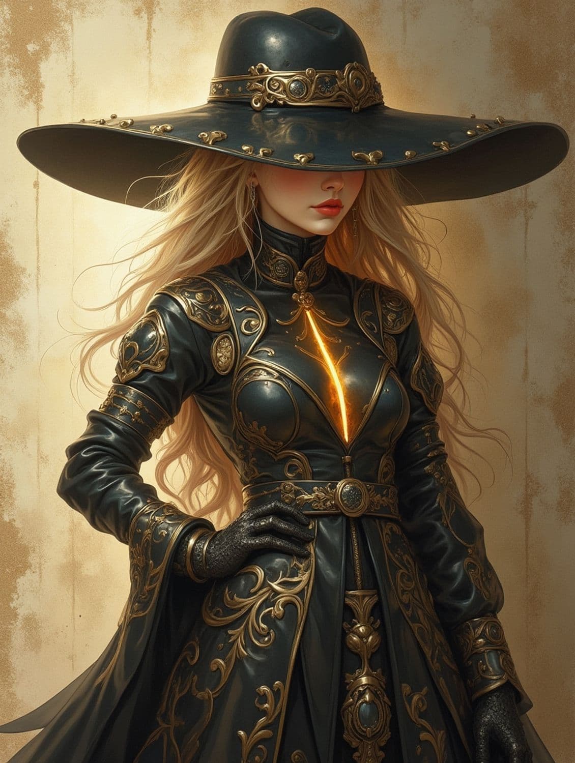 A regal figure stands poised in a luxurious, intricately designed black gown adorned with ornate gold embroidery. The figure wears a wide-brimmed hat, richly decorated with gold motifs, partially obscuring the face. Long, wavy blonde hair cascades down, contrasting with the dark attire. A glowing, vertical light emanates from the gown's center, adding an element of mystique. The attire is embellished with intricate patterns and jewels, conveying an air of elegance and mystery.
