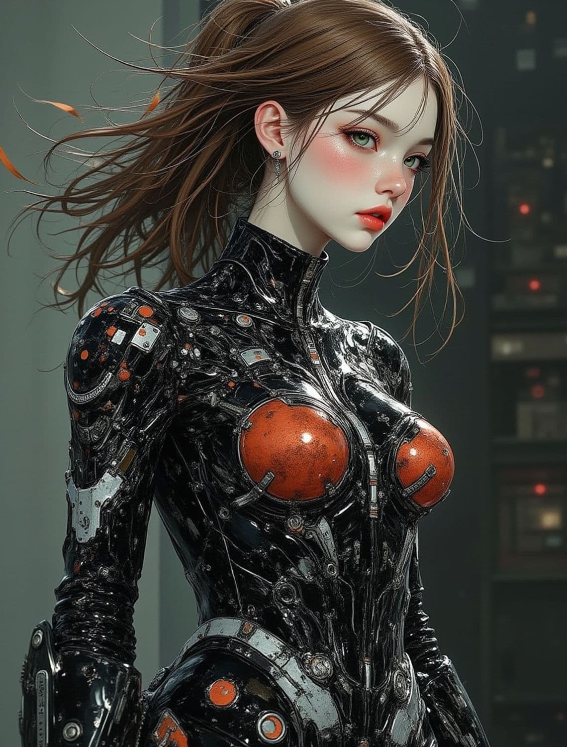 A futuristic female warrior stands confidently, clad in a sleek, black exosuit with intricate metal detailing and striking orange accents. Her piercing gaze is framed by flowing brown hair, and she exudes an aura of strength and determination.