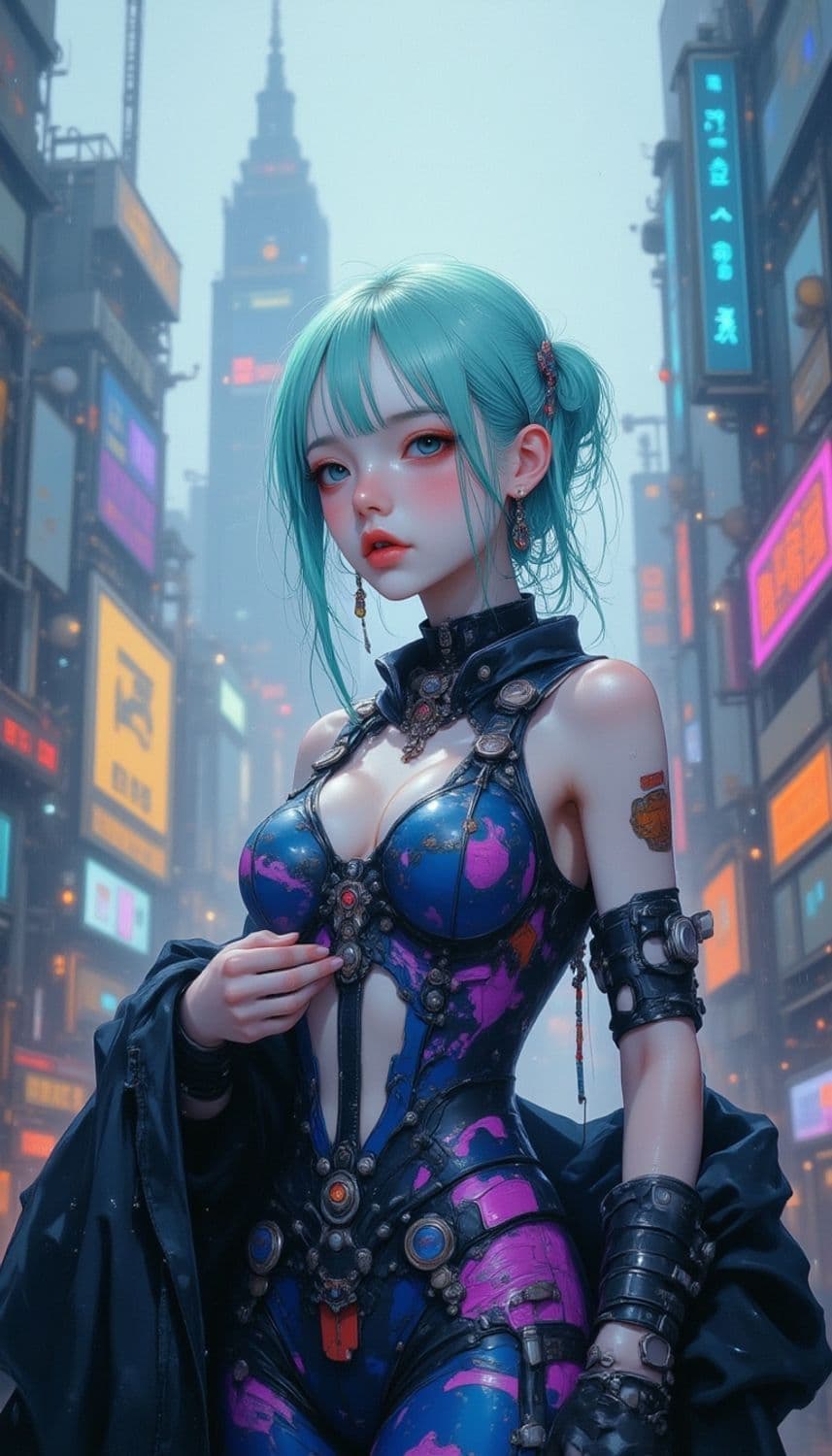 The image depicts a futuristic young woman with light aqua hair against a cyberpunk cityscape backdrop. She is dressed in a striking, form-fitting outfit with intricate designs and armor-like pieces. Her expression is serious, with glistening pink and blue elements complementing the neon-lit urban environment.