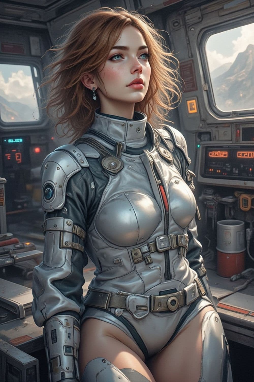 A young woman with shoulder-length hair, wearing a futuristic armored suit, sits inside a high-tech space vehicle. The interior has sleek controls and displays, with a view of a mountainous landscape through a window. Her expression is calm and contemplative, embodying a sense of readiness and adventure.