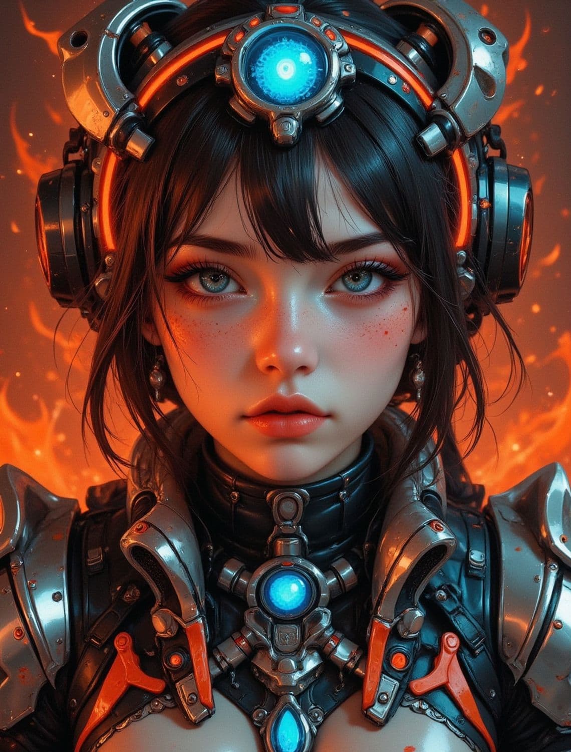 A futuristic female figure with striking blue eyes, adorned in advanced armored gear. Her head is encircled by a metallic headset with glowing blue energy, complementing her high-tech armor that features intricate designs and glowing accents. The background is ablaze with fiery shades, adding an intense, dynamic atmosphere.