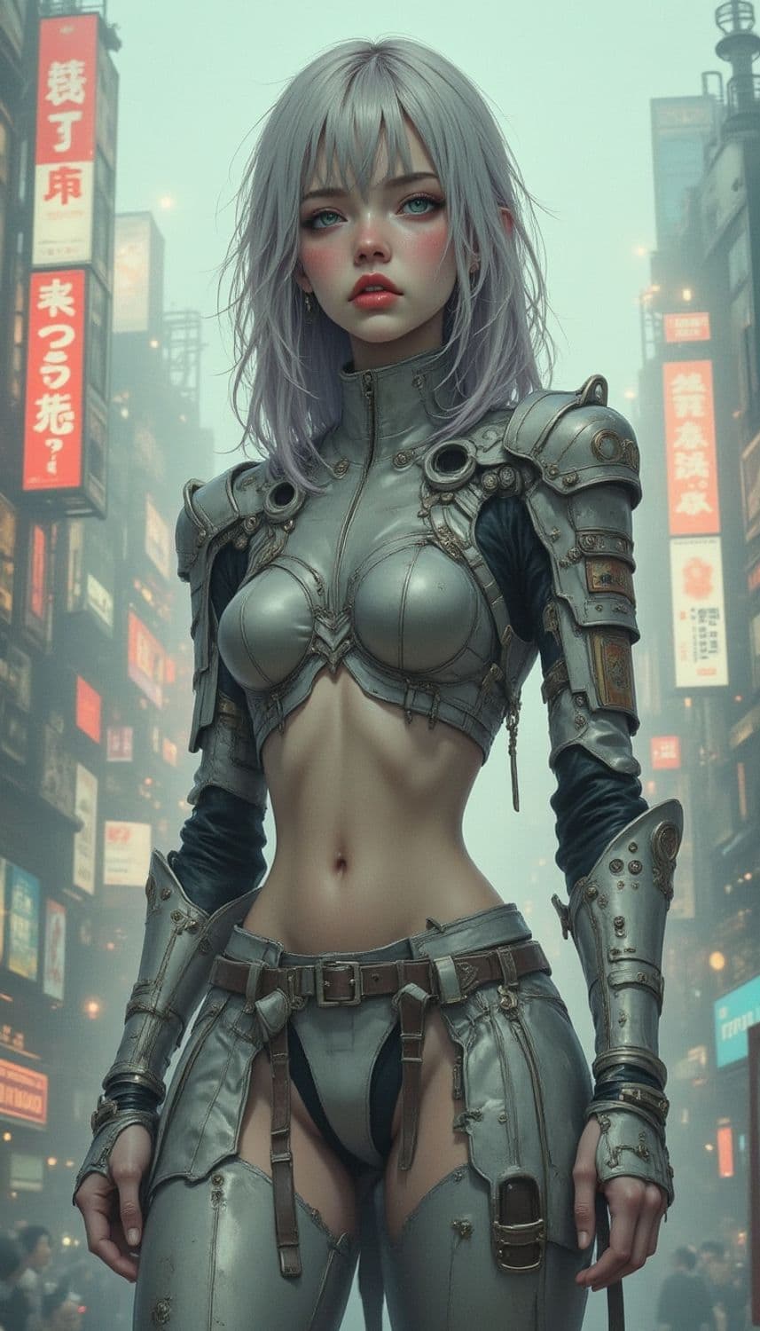 The image depicts a futuristic female character with silver hair and detailed armor. She stands confidently in a neon-lit urban environment. Her attire is composed of intricate metallic elements with a focus on protection and style. The background is filled with signs and buildings, adding a cyberpunk aesthetic.